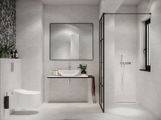 Ca atmosfera in baie sa nu fie una rece, cel mai bine este sa alegem materiale intense care sa nu lase impresia unei bai mult prea incarcate. Putem opta pentru o pardoseala din gresie marmorata sau pentru obiecte decorative, precum o floare intr-un ghiveci mare sau un scaun vintage din lemn pe un fundal alb. Vom vedea ca toate aceste mici detalii ne vor oferi estetic, o incapere mai luminoasa si mai aerisita.