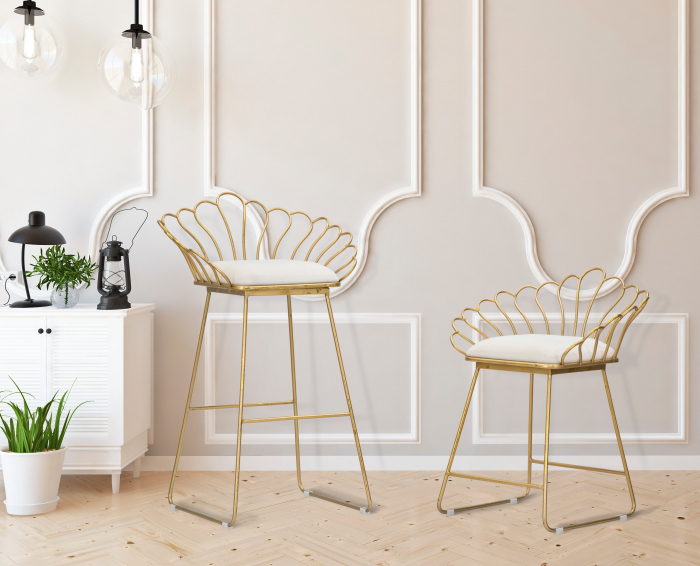 Copurile de mobilier realizate din metal auriu sau argintiu dau un aspect luxury, sau art deco, prin anumite piese cu modele geometrice din jocuri de linii ortogonale imbinate de linii curbe curbe. Sunt prezente produse in stil minimalist sau cu decoratii.