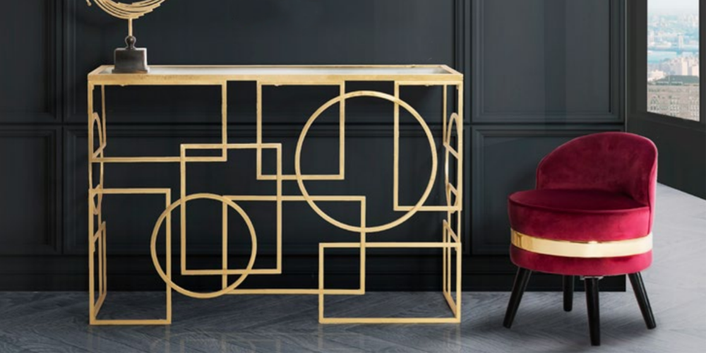 Copurile de mobilier realizate din metal auriu sau argintiu dau un aspect luxury, sau art deco, prin anumite piese cu modele geometrice din jocuri de linii ortogonale imbinate de linii curbe curbe. Sunt prezente produse in stil minimalist sau cu decoratii.
