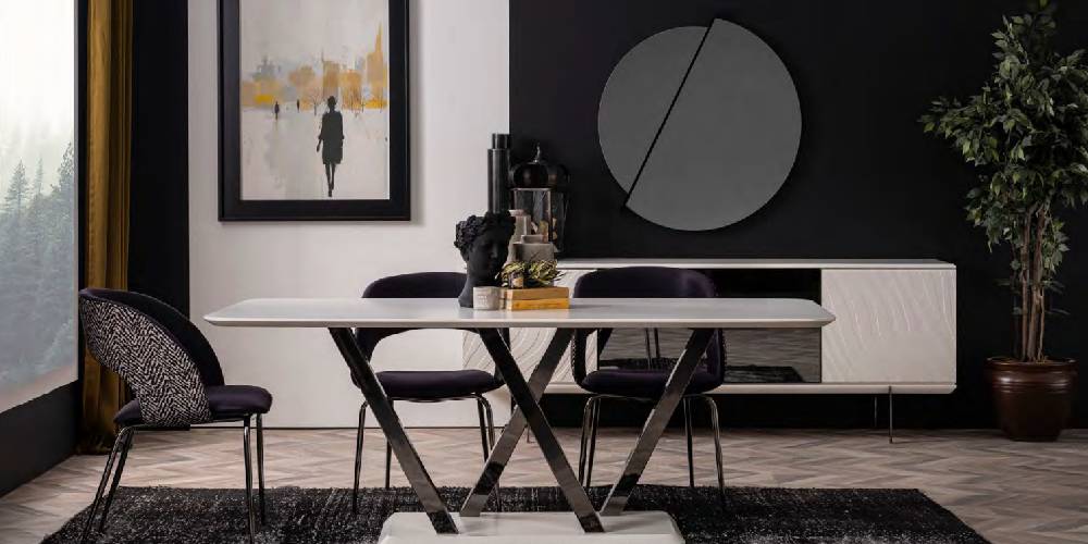 Finisajele lucioase imbinate cu elementele argintii, reprezinta un contrast subtil pentru zona de luat masa