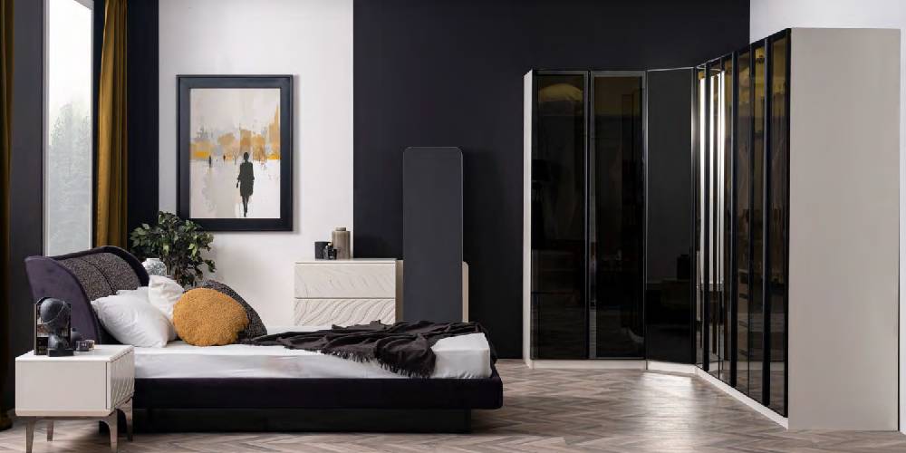 Sticla inchisa la culoare, finisajele fine ale mobilierului si nuantele neutre, creeaza un cadrul deosebit al dormitorului de lux